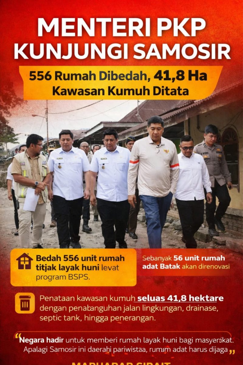 Samosir,  – Menteri Perumahan dan Kawasan Permukiman (PKP), Maruarar Sirait, melakukan kunjungan kerja ke Kabupaten Samosir untuk meninjau langsung calon penerimaMenteri PKP Maruarar Sirait Kunjungi Samosir, 556 Rumah Dibedah dan 41,80 Hektare Kawasan Kumuh Ditata program Bantuan Stimulan Perumahan Swadaya (BSPS) serta penanganan kawasan kumuh di Kecamatan Simanindo, Selasa (25/3/2026).