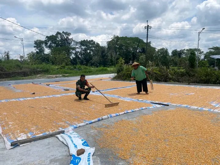 Dengan penuh keakraban, Kopda Manik turut terlibat langsung membantu Bapak Aritonang menjemur jagung di bawah terik matahari. Kegiatan sederhana ini menjadi momen kebersamaan yang mempererat hubungan antara TNI dan masyarakat.